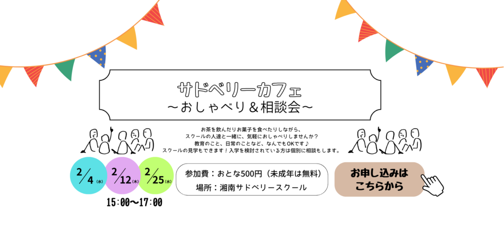 こんにちは。湘南サドベリースクールです。 2026年2月4日(水)12日(木)25日(水)にサドベリーカフェを開催します!入学検討の方はもちろん、一般の方も参加できるイベント… -