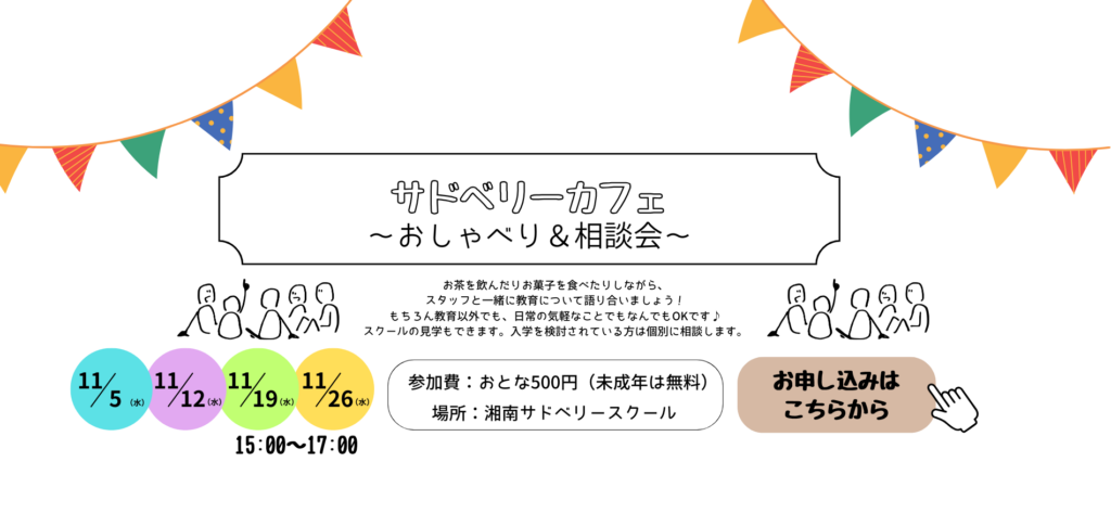こんにちは。湘南サドベリースクールです。 2025年11月5日(水)12日(水)19日(水)26日(水)にサドベリーカフェを開催します。入学検討の方はもちろん、一般の方も参加でき… -